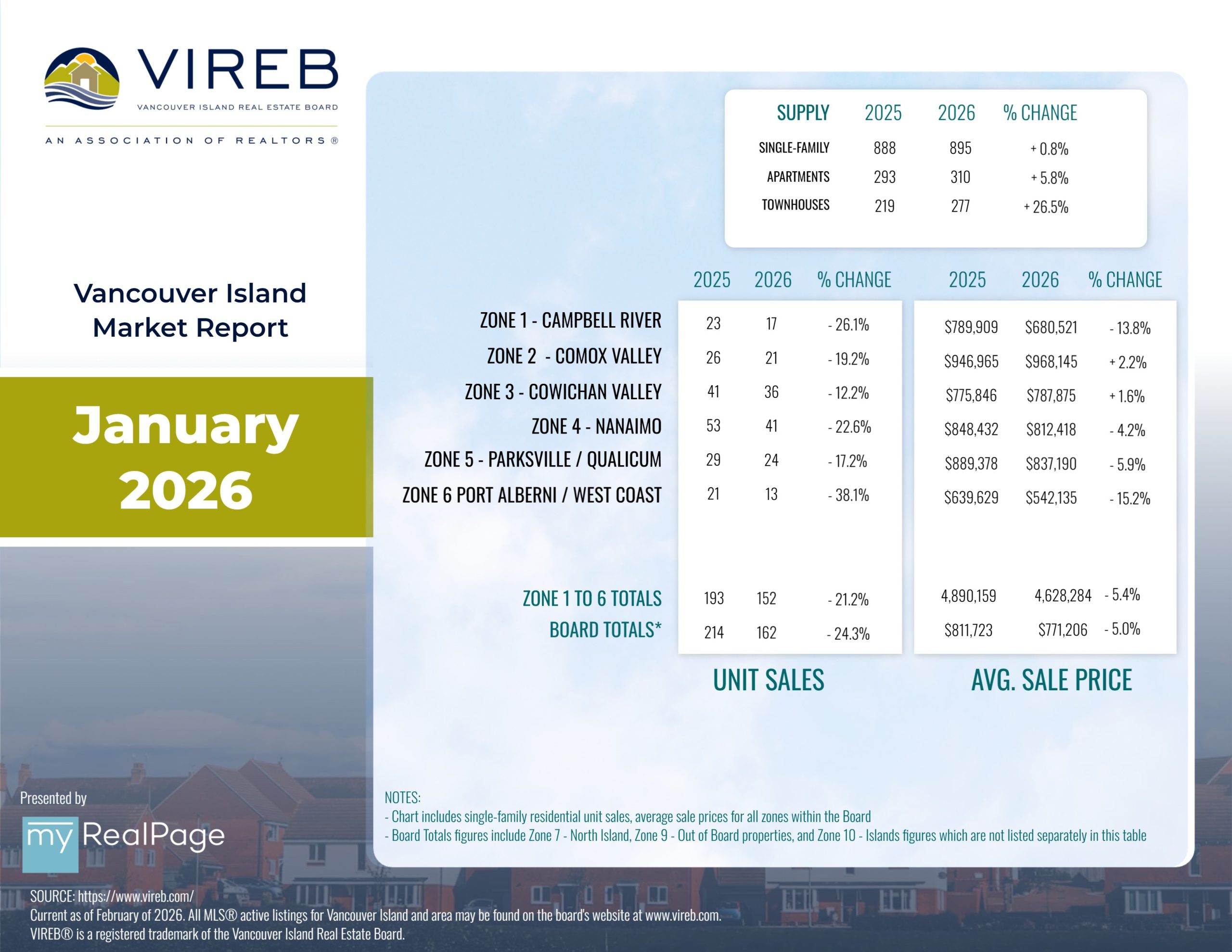 The Vancouver Island Real Estate Board (VIREB) recorded 388 unit sales (all property types) in January 2026, down 10 per cent from one year ago. Year-over-year active listings (all property types) were 3,157, up six per cent from the previous year.
